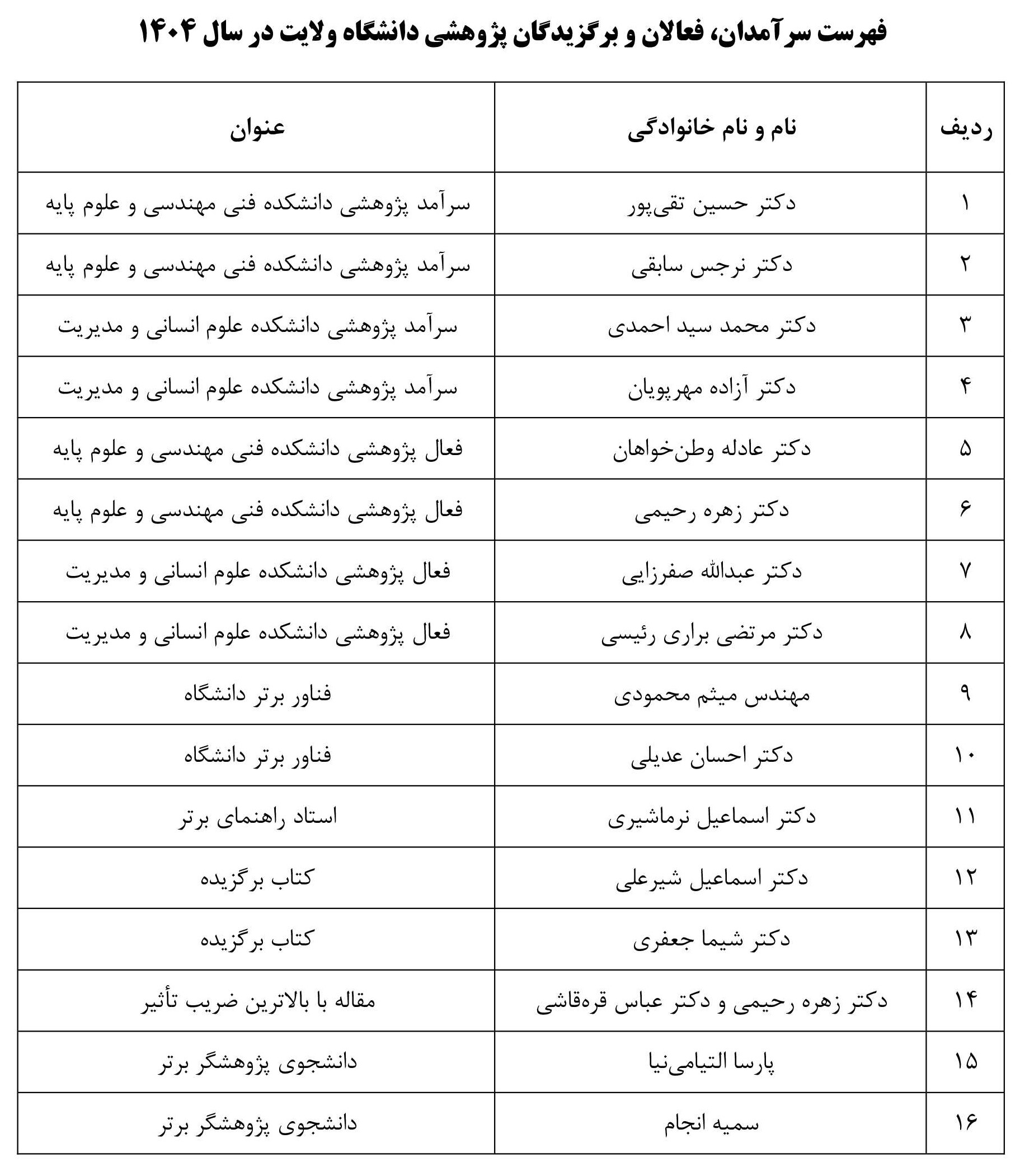 و در نهایت، از سرآمدان، فعالان و برگزیدگان پژوهشی دانشگاه با اهدای لوح تقدیر و هدایایی، از زحمات علمی و پژوهشی آنان به شرح جدول زیر تجلیل شد: